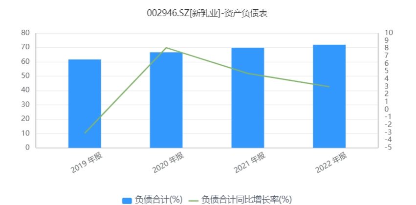 截至2020年末、2021年末、2022年末,新乳业的资产负债率持续走高,分别为66.65%、69.81%、71.91%,而这一指标在2019年为61.66%,3年增加了超10个百分点。