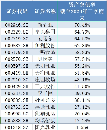 新乳业的资产负债率远远高于同业。截至2023年三季度末,公司的资产负债率为70.48%,在16家上市乳制品企业中排名第一。