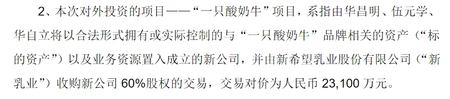 新乳业投资的“一只酸奶牛”项目,就是指由华昌明、伍元学、华自立(3位合称“标的创始人”)将以合法形式拥有或实际控制的与“一只酸奶牛”品牌相关的资产以及业务资源,置入成立的新公司,这家新公司就是重庆瀚虹,并由新乳业出资约2.3亿元取得这家公司60%的股权。