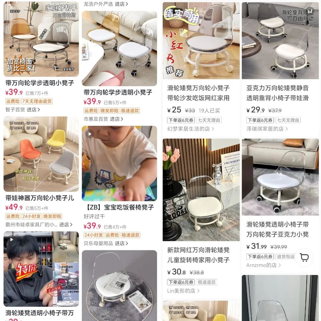 日日卖爆的第一个单品是把小椅子。从抖音商城发现这款小椅子后,她转头就在小红书搜索,有商家售卖的同款是39元一把,她立刻设定了36块的价格,上线——即使比同行便宜3块钱,这款产品依然有接近50%的利润。