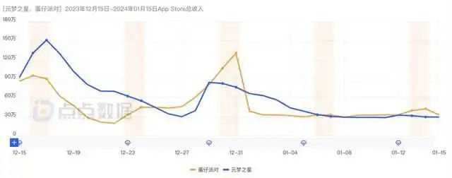 据点点数据,2023年12月25日前《元梦之星》收入超过《蛋仔派对》;25日至1月1日,《蛋仔派对》发力,收入反超《元梦之星》;1月6日后,两款游戏的收入趋于接近;1月12日后《蛋仔派对》继续反超。