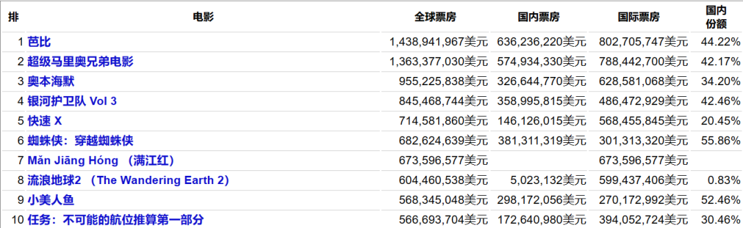 其中,由格蕾塔·葛韦格掌舵的《芭比》首映便席卷1.62亿美元,打破玩具改编和女性执导电影等多项影史纪录,以6.36亿美元排到北美历代总榜第11位,并在世界各地掀起一股“芭比粉”风暴,且以逾14亿美元登顶年度全球头名。