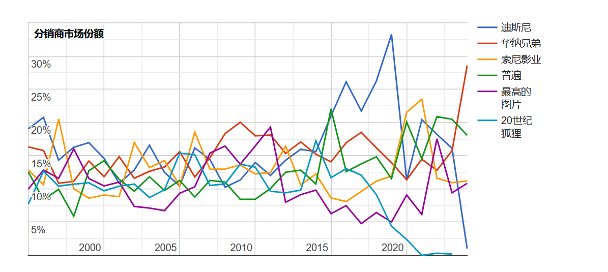 另外,迪士尼以14.45亿美元连续三年位居次席,且发行总影片只有12部,相当于环球的1/4强;若与自身相比,迪士尼离巅峰期仍相距甚远,其在2019年曾以37.4亿美元傲视群雄,但此后却连突破15亿美元都面临困难。