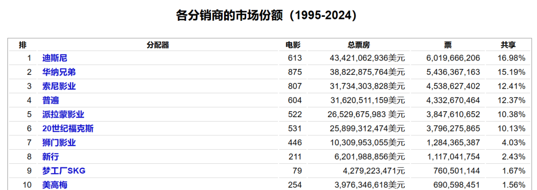华纳兄弟以逾14亿美元屈居季军,与迪士尼仅有4065万美元的微弱差距。原“六大”的其他成员,包括索尼(9.83亿美元)和派拉蒙(8.42亿美元)分列第4及5名,狮门则力压已被迪士尼并购的20世纪影业,时隔四年重返前六强内。