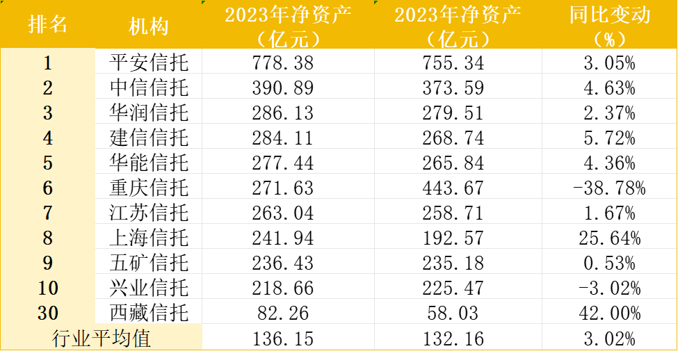 净资产方面,52家信托公司净资产与2022年相比增加1.49%。行业平均值为136.15亿元,同比增加3.02%。