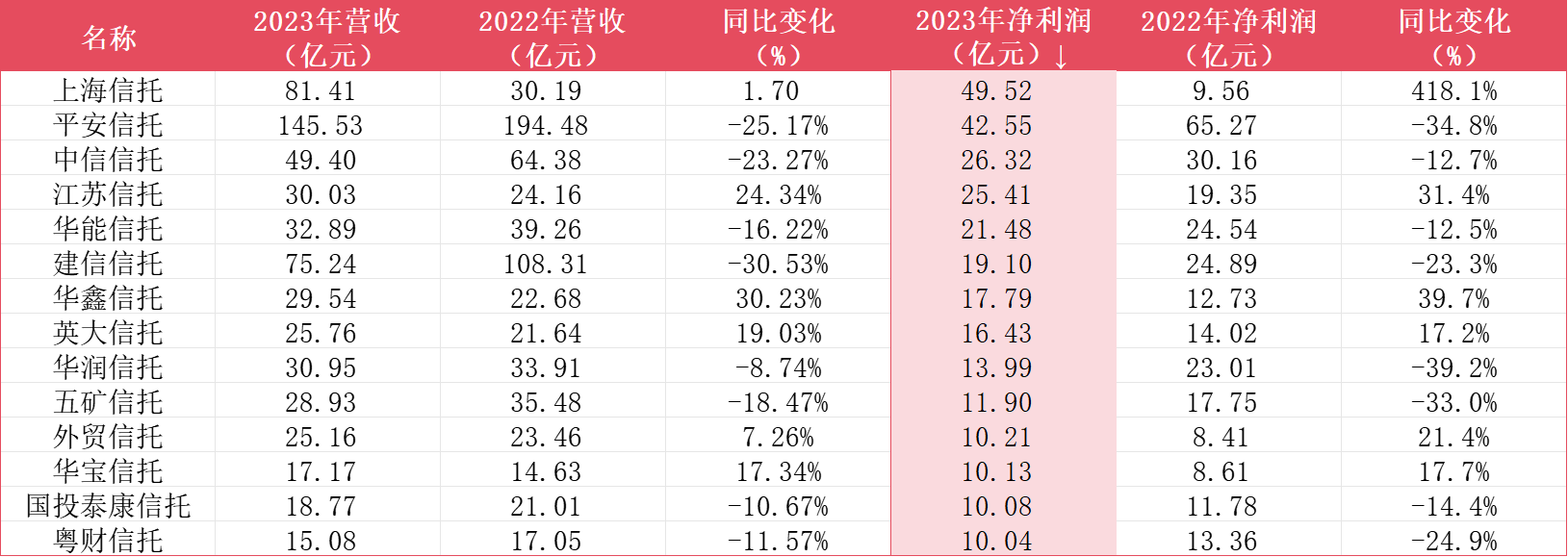 不过,界面新闻记者观察到,2023年,52家信托公司中有14家净利润规模达到10亿元以上,数量较2022年增长1位。