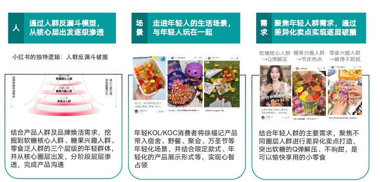 在选定产品后,徐福记利用小红书特色的“人群反漏斗模型”找到核心沟通人群,并挖掘出年轻人的消费场景,通过打造差异化卖点,去做深耕和进一步拓圈,最后实现在2个月内登顶糖果赛道内容渗透率第一的成果。
