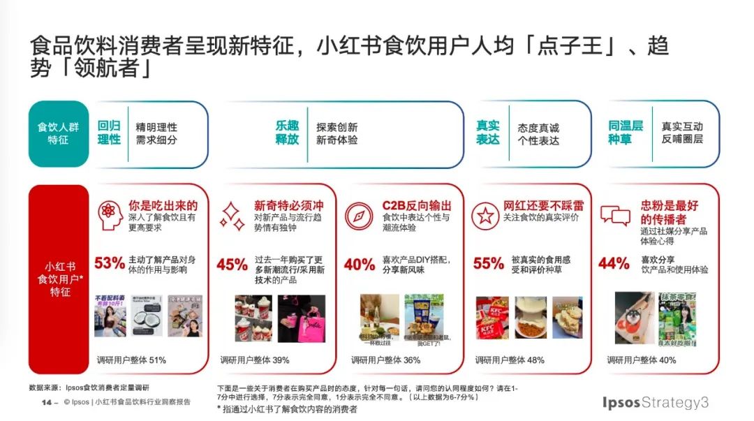 数据也显示,相比较行业整体,小红书食饮人群的特征,是更理性、更喜欢探索、态度更真诚以及更爱分享的一波人。