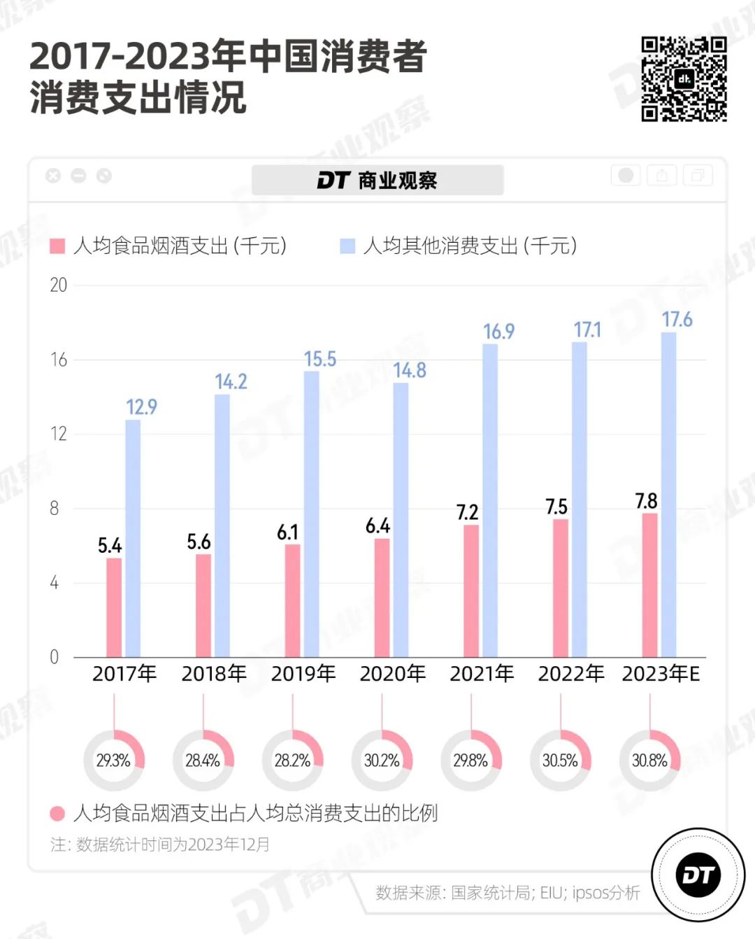 从行业层面来看,食品饮料作为必需消费品,一直受消费者重视,具备一定程度的抗周期性。过去几年,人们在食饮上的开支逐年增长,且近三年的占比越来越高。