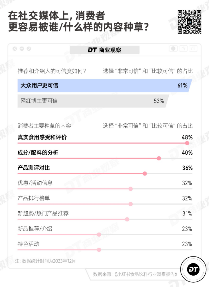 《小红书食品饮料行业洞察报告》(下称《报告》)显示:从信息源来看,相比较KOL的权威,人们更相信来自大众用户的推荐;