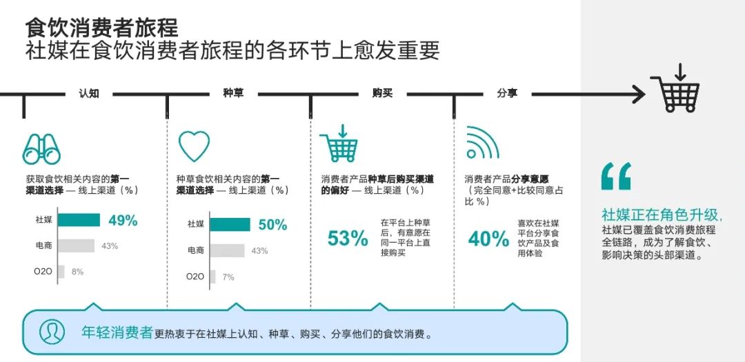 人们在社媒上了解食饮新趋势、新产品——根据社媒上其他的用户反馈,被种草——直接在种草平台上购买——消费之后,在社媒上分享体验,这些体验继续传播,反哺社区,对其他用户的消费决策产生影响,形成同温层种草。