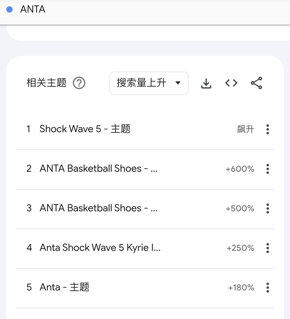 过去7天,Google全球 ANTA(搜索字词)的相关主题 图源:Google Trends
