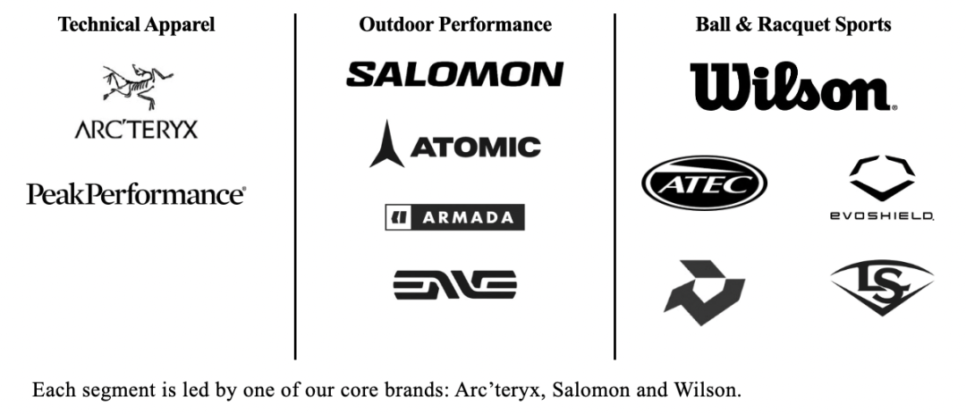 除了始祖鸟和Salomon,亚玛芬还拥有包括Wilson(威尔胜)、Peak Performance(壁克峰)和Atomic(阿托米克)在内的9个来自不同国家的品牌。始祖鸟、Salomon、Wilson分别领衔硬核技术服装(Technical Apparel)、户外服饰&装备(Outdoor Performance)、球类及球拍装备(Ball &Racquet Sports)三大核心部门。