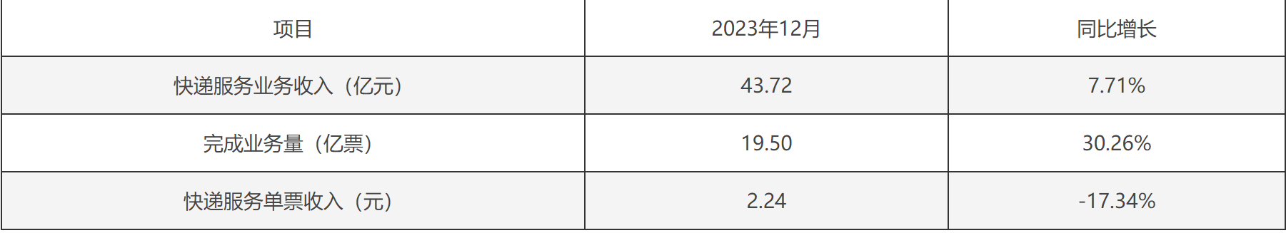 韵达股份1月19日公告,2023年12月公司快递服务业务收入43.72亿元,同比增长7.71%;完成业务量19.50亿票,同比增长30.26%;快递服务单票收入2.24元,同比下降17.34%。
