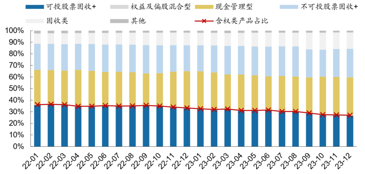 加大现金及存款类资产的配置是2023年以来的整体趋势,根据广发证券的统计,自2023年以来以现金及银行存款为代表的货币市场类资产占比明显上升;与之相反,固收类资产占比则呈下降趋势。2023年三季度,货币市场类资产占比较去年同期上升0.7pct至34%。