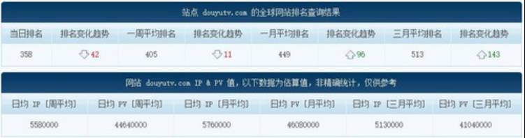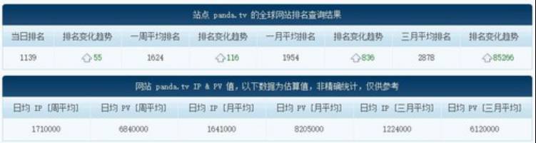 另外一份数据也十分能够说明问题,2015年底,有网站利用Alexa对各直播平台进行了流量监测,根据Alexa统计的数据,在最能体现流量数据的3个月平均排名和3个月内的平均日均IP中,斗鱼分别为513名,513万IP,而熊猫则是2878名,122.4万日均IP,虎牙为3911名,97.8万日均IP。