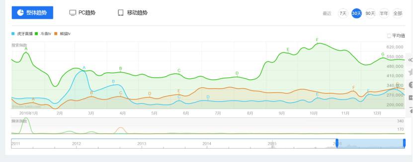 而此举也收到了立竿见影的效果,同样是百度指数的数据,在2016年2月开始,受到Miss等大主播的带动,虎牙一度在流量上有明显的上升趋势,接近第一的斗鱼。