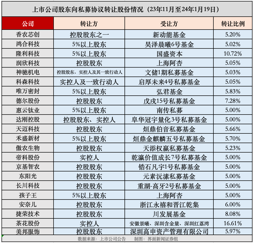 自2023年11月以来,上市公司协议转让公告明显增多。据界面新闻记者不完全统计,2023年11月至今年1月19日,仅沪深两市已有近百家上市公司发布协议转让公告。此外,还有至少15家科创上市公司发布了询价转让公告。