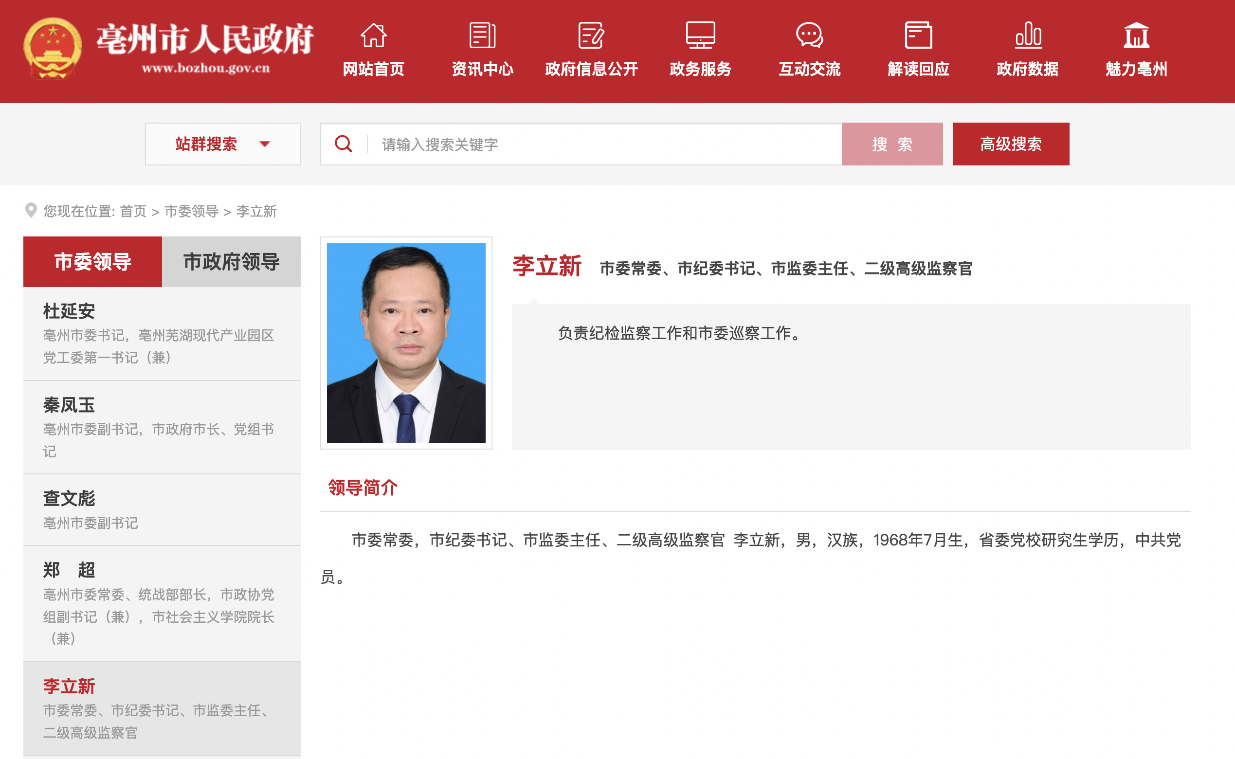 公开简历显示,李立新,男,汉族,1968年7月生,省委党校研究生学历,中共党员,现任亳州市委常委,市纪委书记、市监委主任、二级高级监察官。