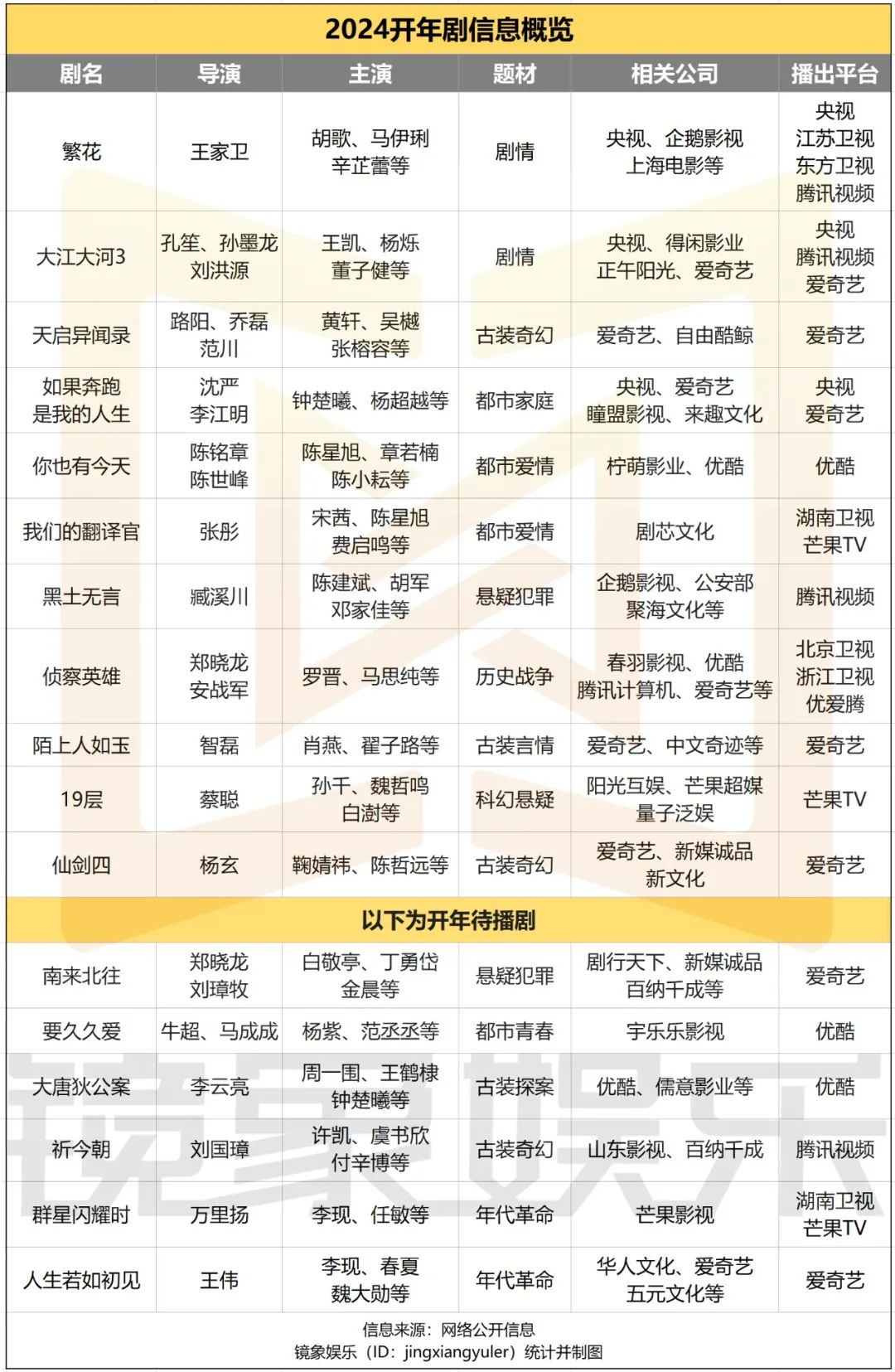 紧随《繁花》之后,爱奇艺释出古装奇幻剧《天启异闻录》,正午阳光带着《大江大河3》入场,陈建斌携手胡军、邓家佳等合作悬疑剧《黑土无言》,郑晓龙新作《侦察英雄》、芒果TV新剧《我们的翻译官》等剧纷至沓来……而在待播剧列表中,白敬亭搭档金晨的新剧《南来北往》、杨紫与范丞丞合作的《要久久爱》、以及优酷的古装探案剧《大唐狄公案》等也颇受市场期待,新一轮交锋之下,开年大剧间的较量还将愈演愈烈。