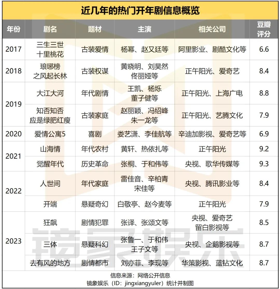 据镜象娱乐不完全统计,在这些热门的开年大剧中,受欢迎的剧集题材,逐渐从古装剧向近当代的现实题材内容转变。尤其是在2019年的《大江大河》成为年度爆款之后,像这样以小人物群像勾勒大时代变迁的现实题材作品,逐渐成为开年剧中爆款频出的类型,后来的《山海情》《人世间》等都延续着这一方向,今年首爆的《繁花》亦是如此。