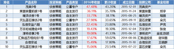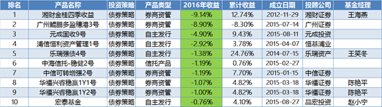 与之相反,2016年垫底债券策略产品均处于亏损状态,其中,“湘财金桂四级收益”和“广州鲲鹏多赢穗港3号”亏损最多,分别以-9.14%和-8.9%位居前两名,这两只产品均属于券商资管,投顾公司为湘财证券和广州证券。另外,垫底的十只产品中“中信可转稳强2号”、“华福兴睿稳盈1Y1号”、“华福兴睿稳盈1Y2号”也属于券商资管产品。
