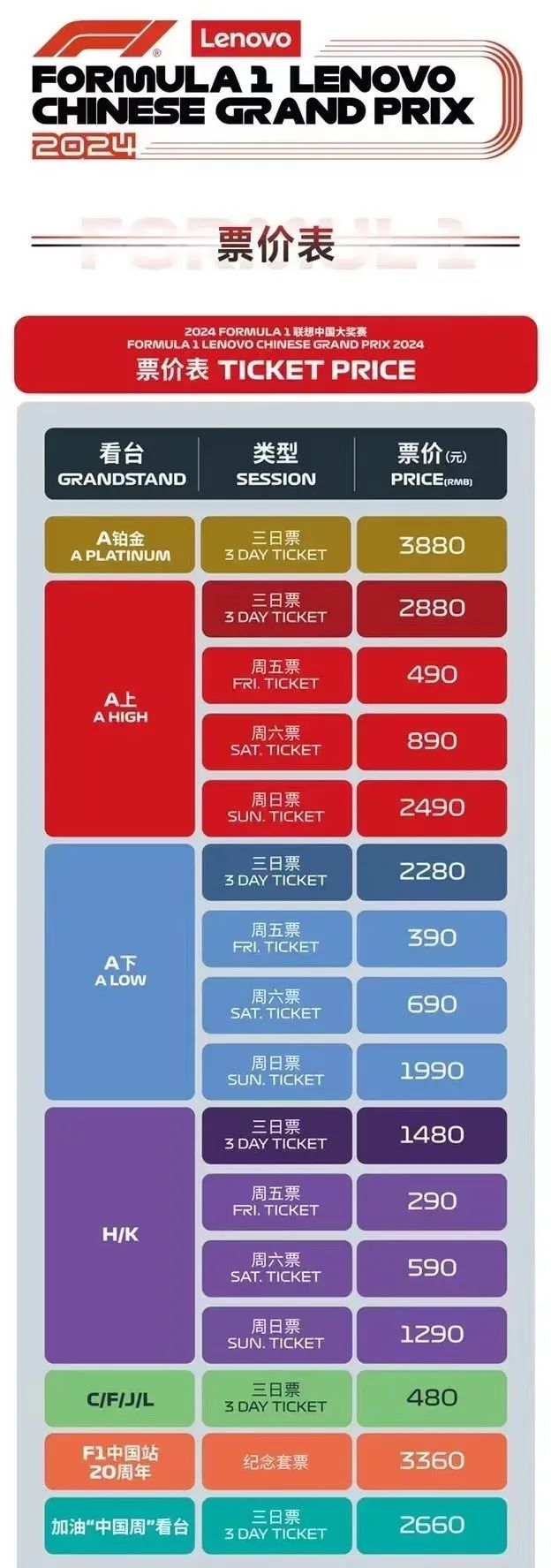 2024 F1中国大奖赛最高价的铂金看台票售价3880元,20周年纪念套票售价3360元,三日票最低480元起。