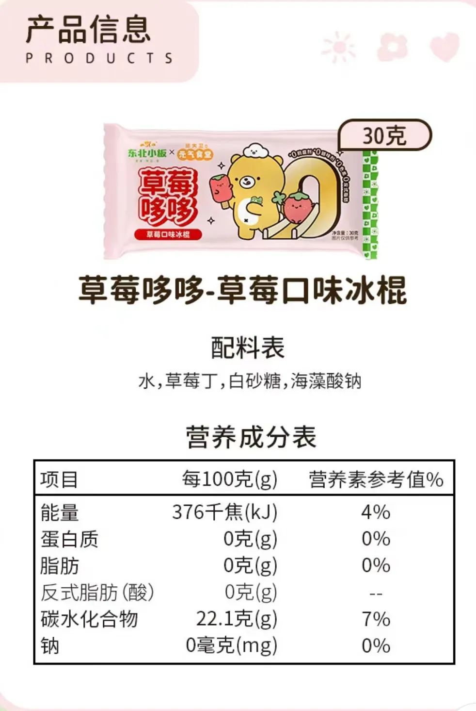 此次东北小板尽量精简配料表,并宣传“清洁标签”,似乎也从侧面应对了消费者一些对东北大板配料表的质疑。目前推出的四款产品中,牛乳啵啵、呼噜可可和优格莓莓的配料表都是5种原料,而草莓哆哆的配料表只有4种原料。