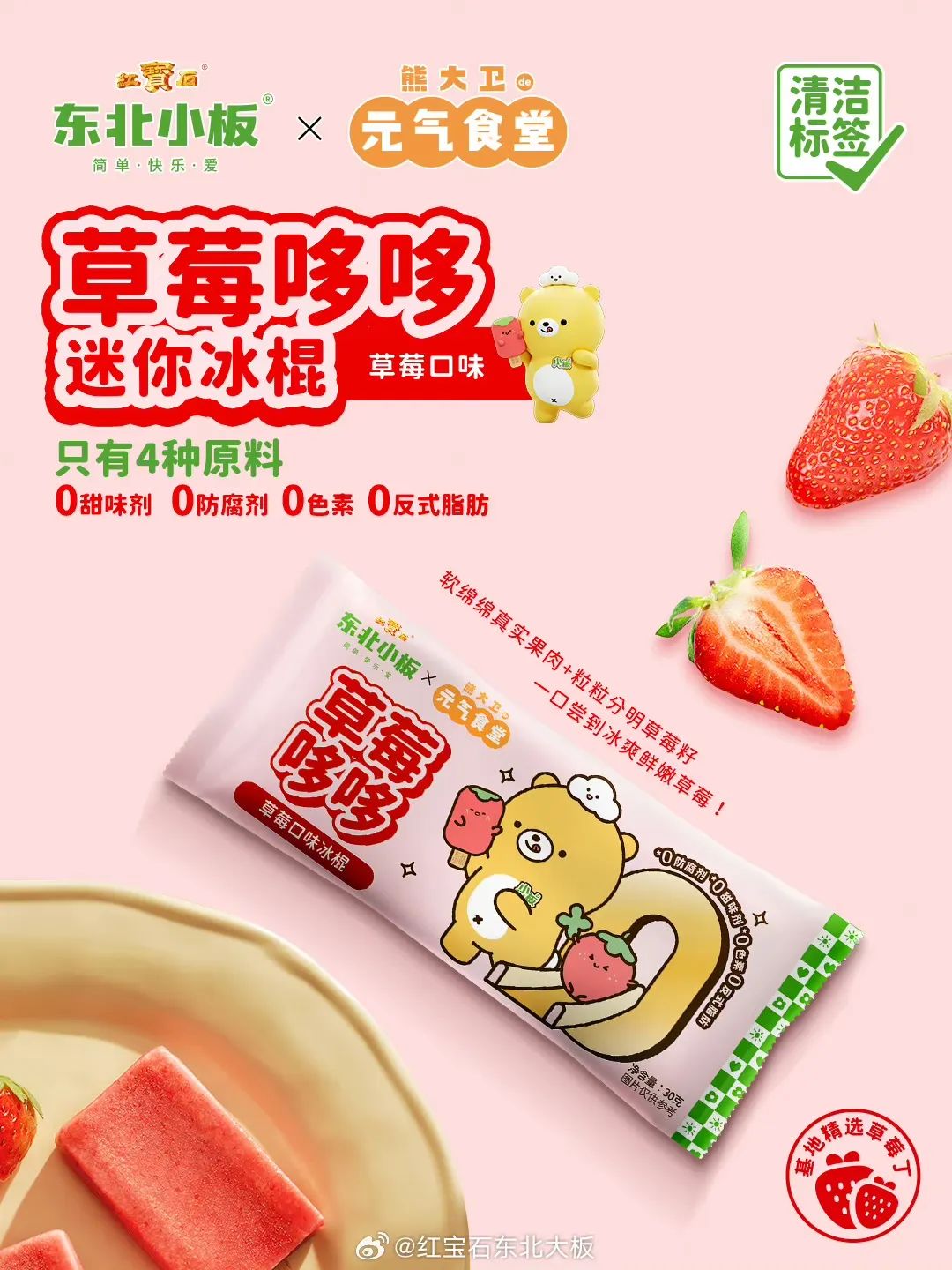 作为东北大板的兄弟品牌,红宝石此次推出的东北小板主打儿童友好。品牌表示其产品只有4+1种原料,0甜味剂、0防腐剂、0色素、0反式脂肪,共有牛乳啵啵、呼噜可可、优格莓莓、草莓哆哆四种口味。