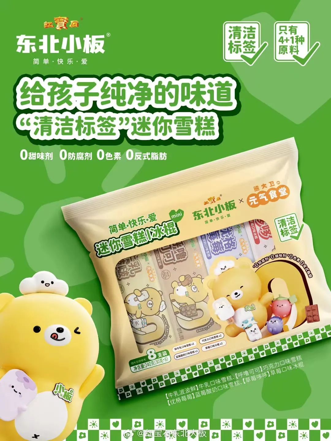 然而,东北小板为了打造属于自己的品牌特色,放弃了东北大板的品牌超级符号,而是选择与元气食堂联名,设计出更卡通可爱的包装,从而吸引儿童群体。