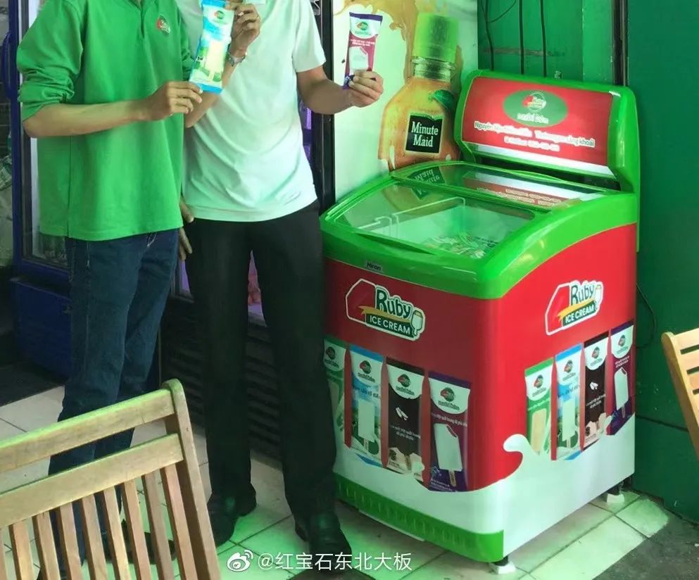 在越南,东北大板依旧使用着经典的红绿色调小冰柜,在异国也保留品牌特色。