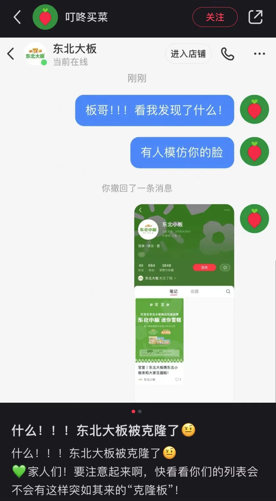 可是最近,却有好些品牌在小红书上向东北大板“举报”有“骗子”在模仿东北大板。例如,叮咚买菜喊话东北大板,说出现了“克隆板”。