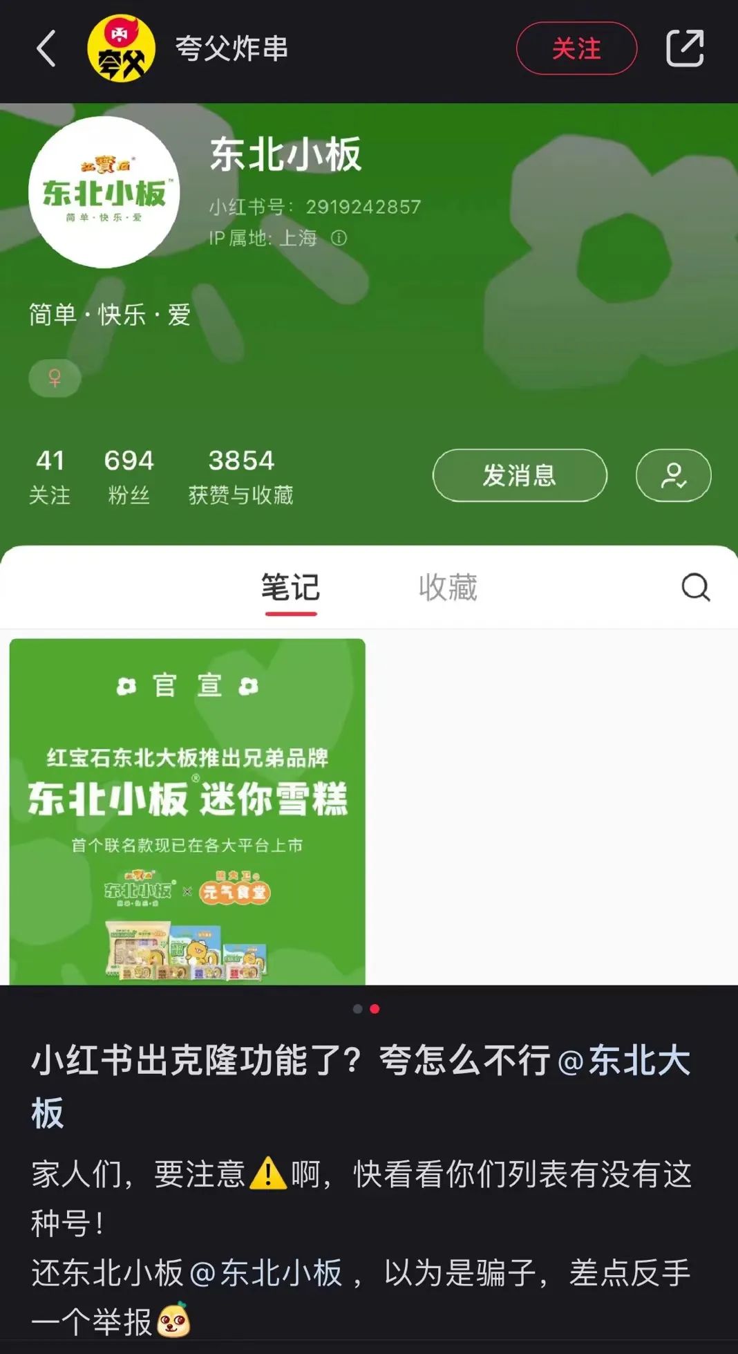 夸父炸串也称小红书出现“克隆”功能,列表里出现了“东北小板”。
