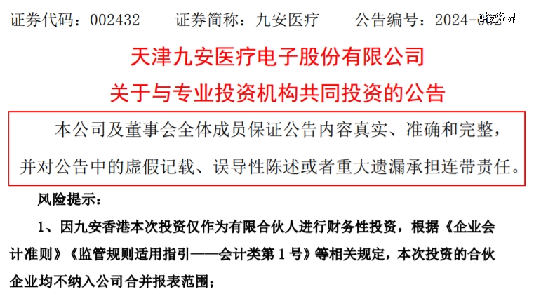 此前在1月17日,九安医疗发布公告称,公司全资子公司Andon Hong Kong Co., Limited(简称“九安香港”)将与另一创投企业“海棠创投”合作,共同设立九棠创投。其后,九棠创投将与海棠创投合作共同设立创投公司九棠一号。九棠一号将作为出资主体向“天开九安海河海棠基金”进行出资。