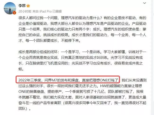 去年六月,李想还在微博上提过旧事,称理想ONE在2022年被问界老M7打残,毫无招架之力,只能提前停产并赔给供应商10亿元。