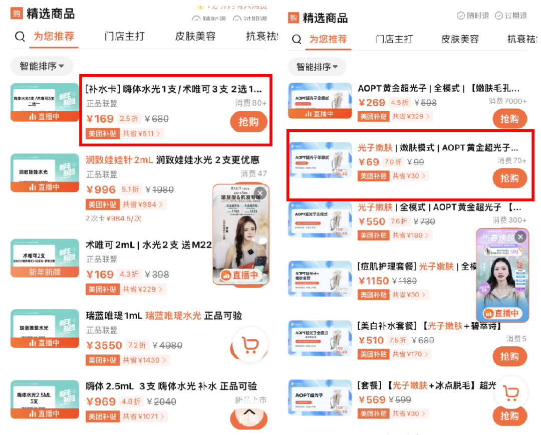 《天下网商》打开大众点评搜索杭州的医美服务发现,以水光针为例,200~500元是主流价格带,某上市医美机构的“嗨体水光针”团购仅售169元。又如光子嫩肤、玻尿酸填充等热门项目,价格百元至千元不等,最低的甚至达到69元。