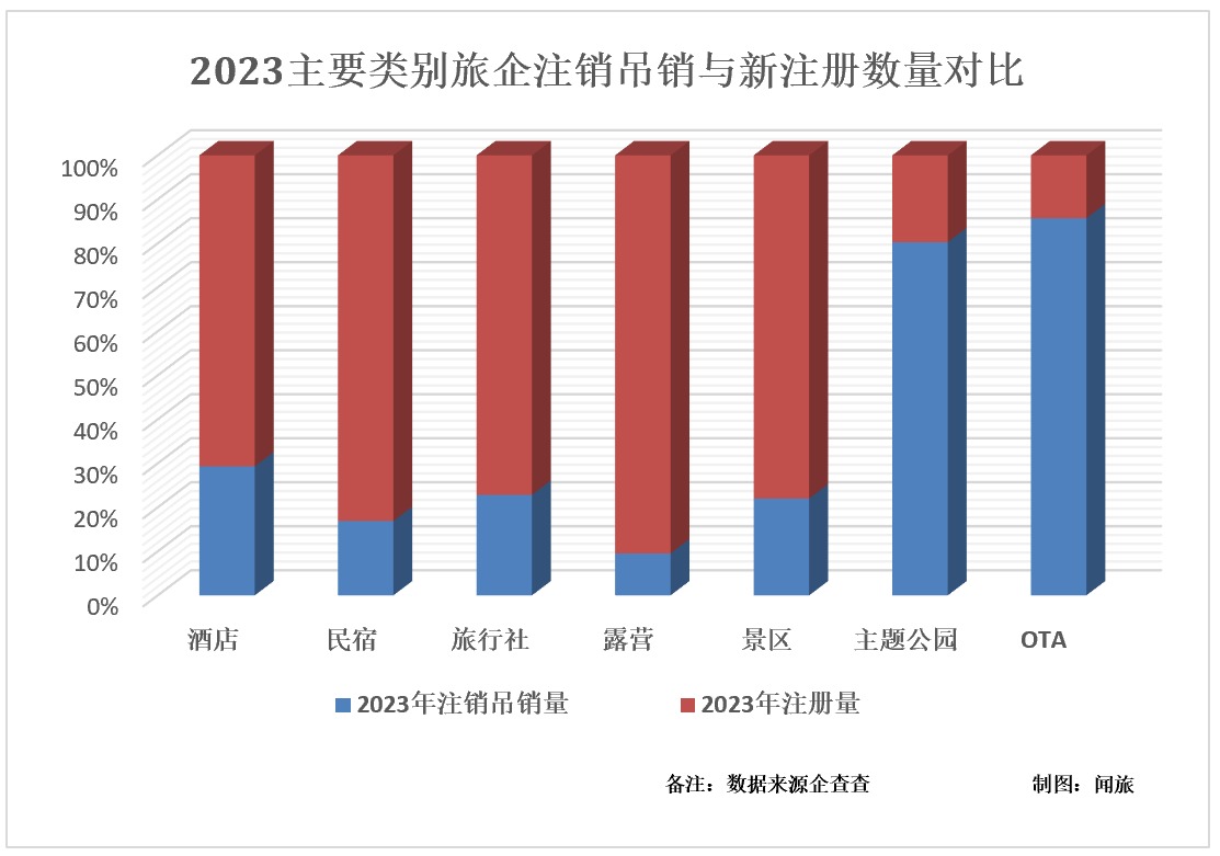 除融资案例盘点外,闻旅也统计了2023年主要类别旅企新注册企业量与注销吊销企业量的比例对比,包括酒店、民宿、旅行社、露营、景区运营企业等等,新注册量远远高于注销吊销量,也能从侧面印证,旅游市场供给链和市场活跃度在快速恢复中。