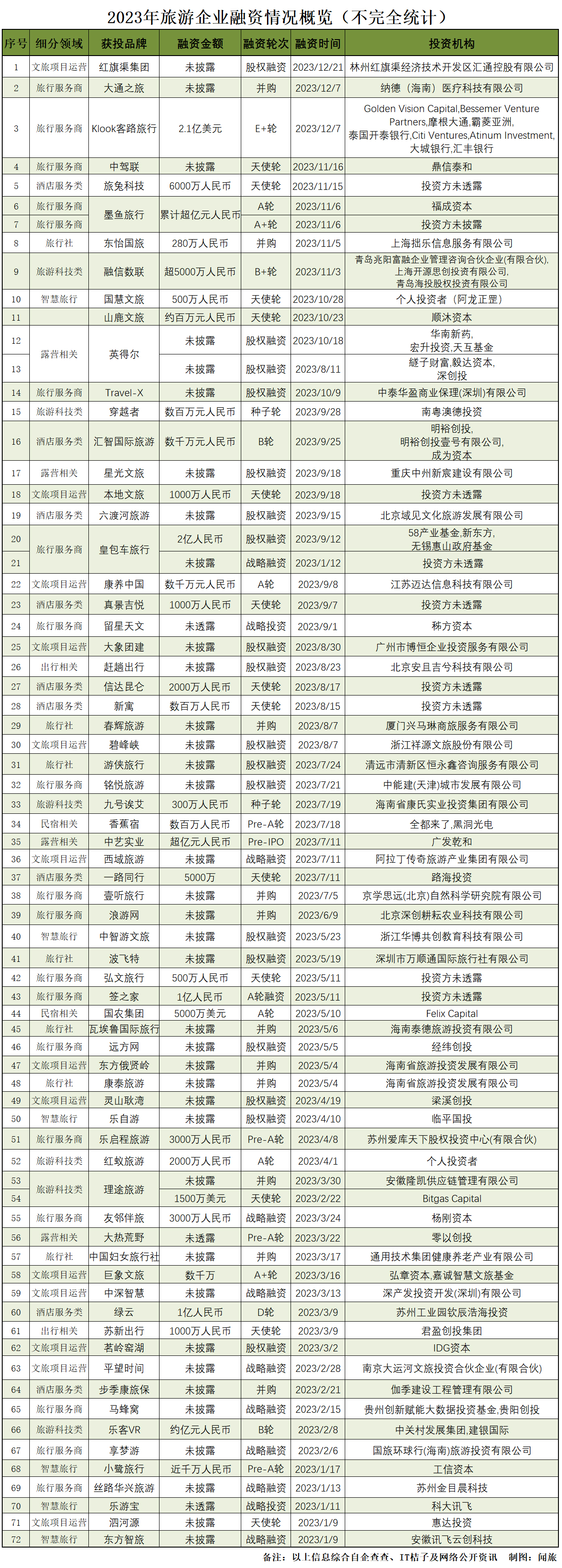 综合自企查查、IT桔子相关融资案例盘点,也能印证这一点与2022年时的投资盘点相比,不仅在数量上有所减少,过亿投资企业也少于2022年。根据闻旅不完全统计,2023年旅游行业共发生投融资事件72起,而2022年时为81起;从融资规模看,2023年获投过亿的旅企有7家,分别为Klook客路旅行、墨鱼旅行、皇包车旅行、中艺实业、签之家、绿云、乐客VR,而2022年时有9家。