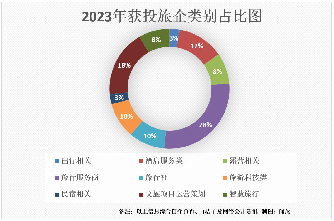 从获投企业类别看,以提供C端服务的旅行服务商占比最大,共发生融资20起,获投比例在28%左右;其次是与文旅项目运营策划有相关的旅企,共发生融资13起,获投比例在18%左右,此外酒店服务相关企业、露营相关企业、旅行社等都是获投相对较多的企业类别,出行类企业的融资发生率为最低,仅有两家企业获投。