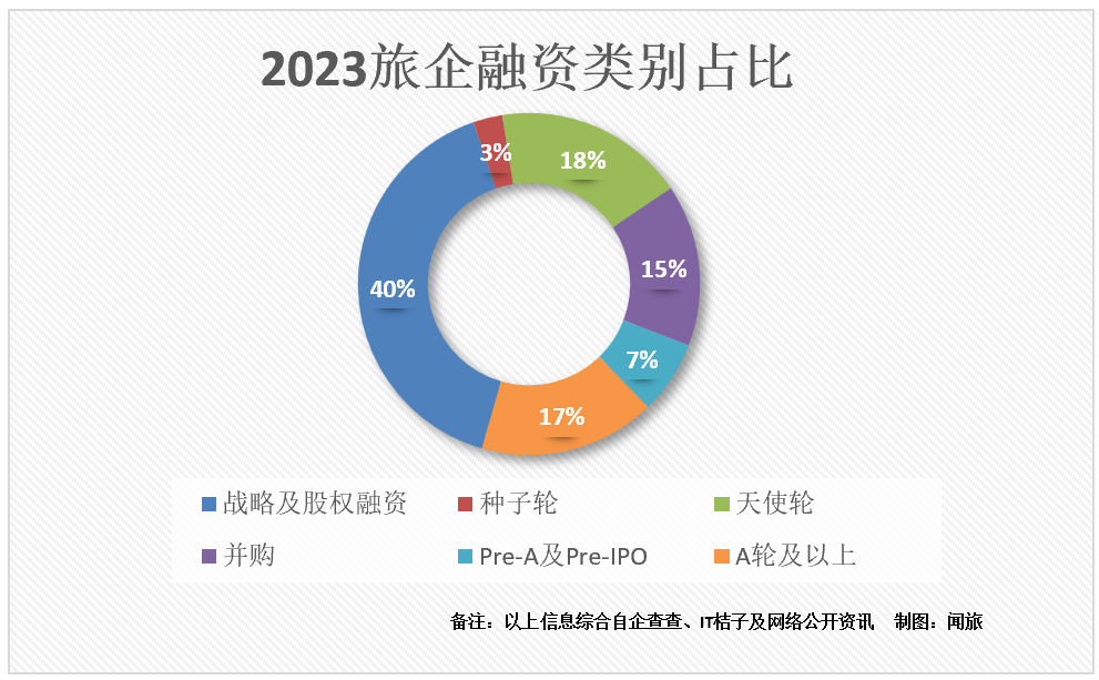 而从融资类别看,2023年发生的旅企融资事件中战略及股权融资比例最高,共计发生29起,占比达40%左右;其次是天使轮融资,发生了13起,占比在17%左右,A轮及以上的融资事件共计发生12起,并购融资则共计发生11起。