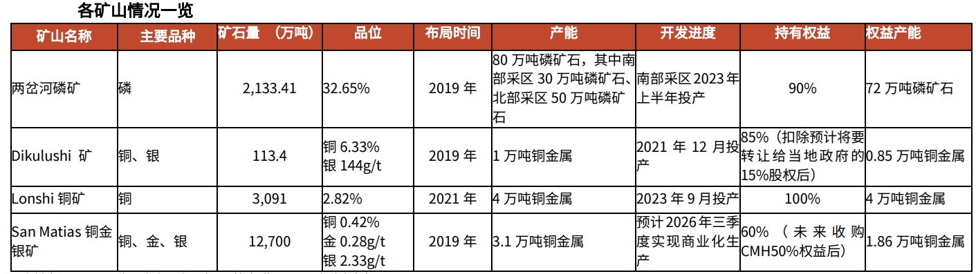 2023年半年报显示,金诚信拥有两岔河矿业磷矿采矿权、Dikulushi和Lonshi铜矿采矿权及其周边七个探矿权,并参股加拿大Cordoba矿业。在2026年哥伦比亚San Matias铜金银矿投产后,其远景铜金属产能将达到8.1万吨,权益产能6.7万吨。