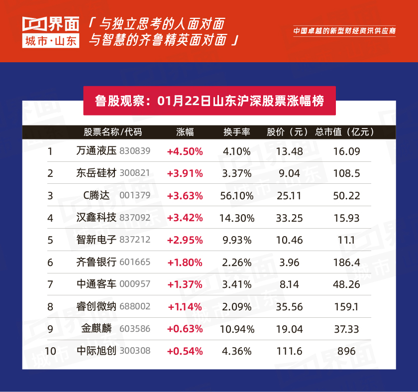 济南市涨幅榜首:齐鲁银行(601665),涨幅:1.8%,股价3.96元,总市值186.4亿元;