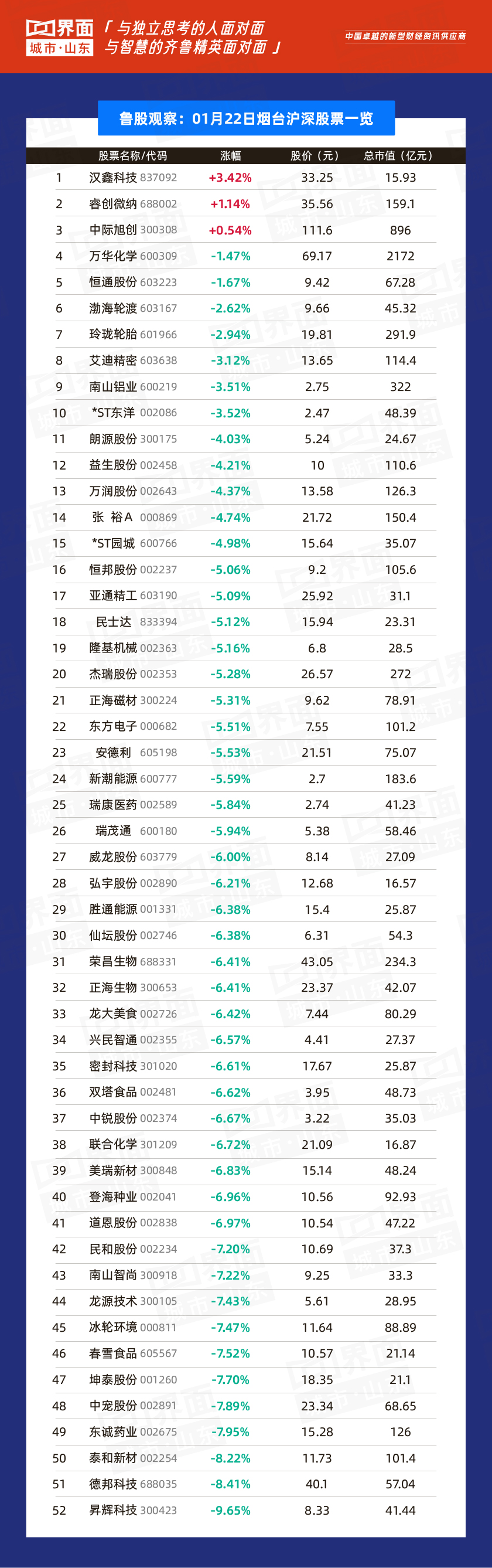 烟台市涨幅榜首:汉鑫科技(837092),涨幅:3.42%,股价33.25元,总市值15.93亿元;