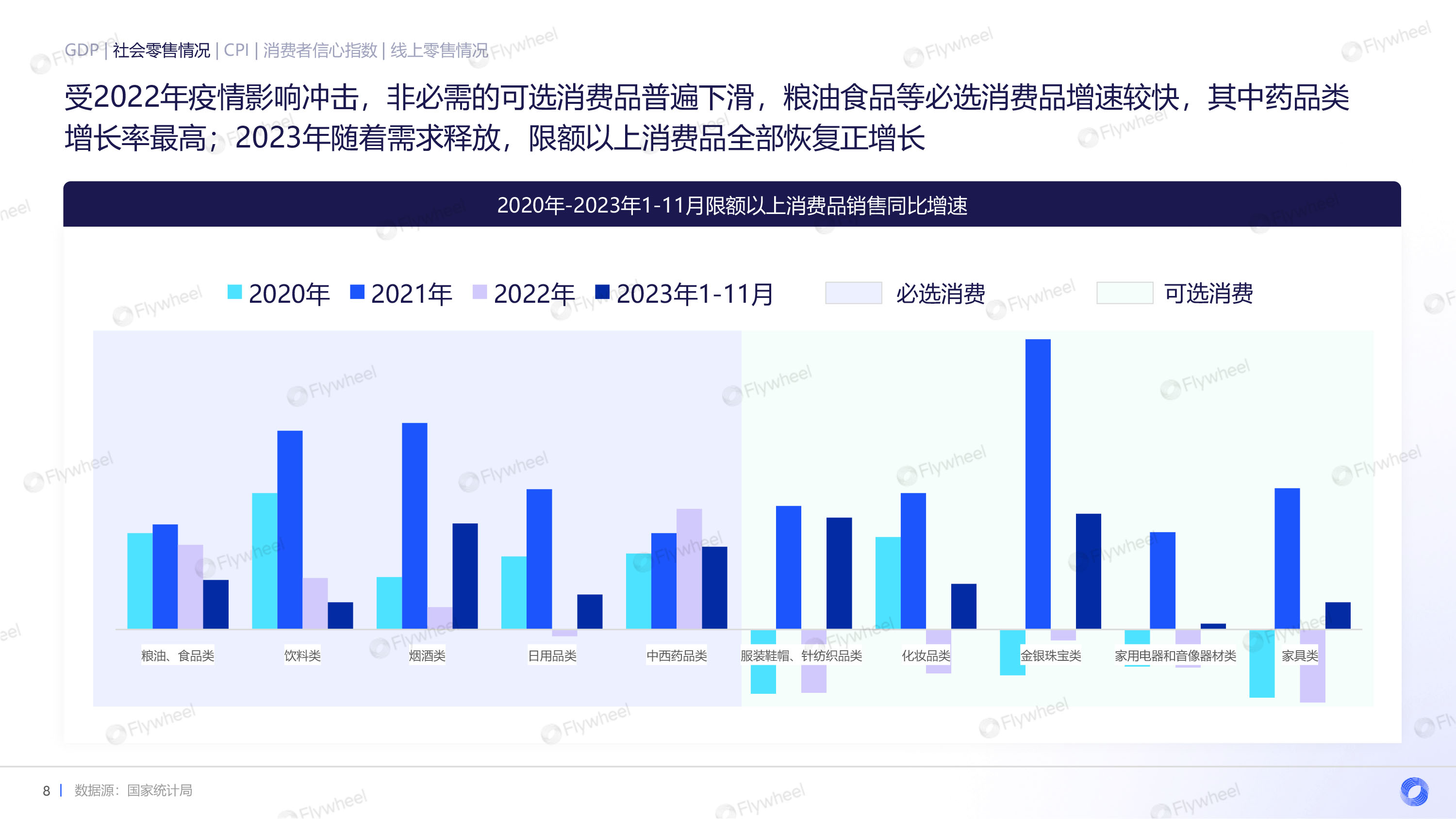 从社零数据来看,受2022年疫情影响冲击,非必需的可选消费品普遍下滑,粮油食品等必选消费品增速较快,其中药品类增长率最高;2023年随着需求释放,限额以上消费品全部恢复正增长。