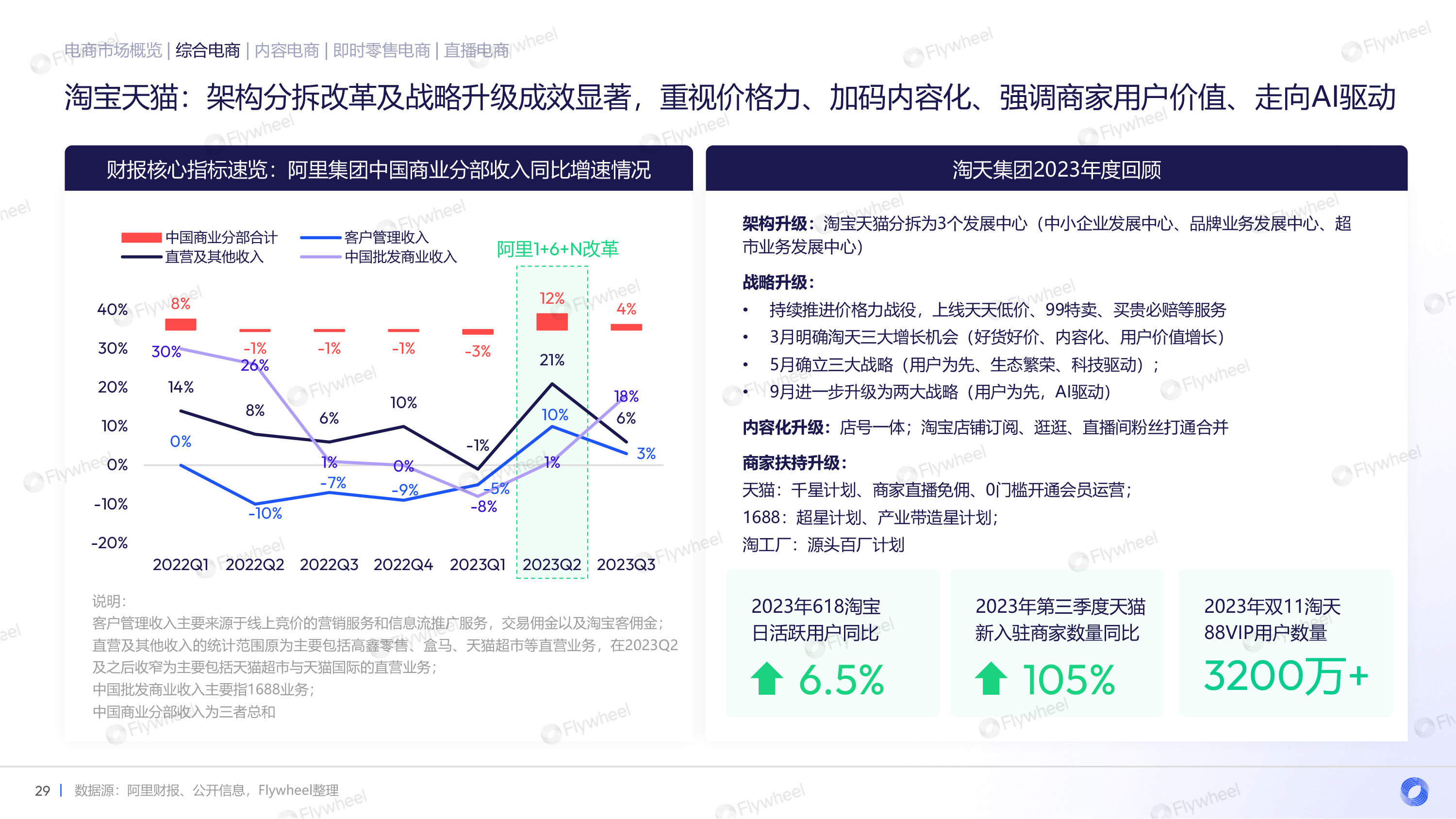 综合电商平台中,阿里集团通过架构分拆改革,提升淘宝天猫的战略地位,其战略升级取得显著成效,重视价格力、加强内容化,强调商家用户价值,并朝着AI驱动的方向发展。