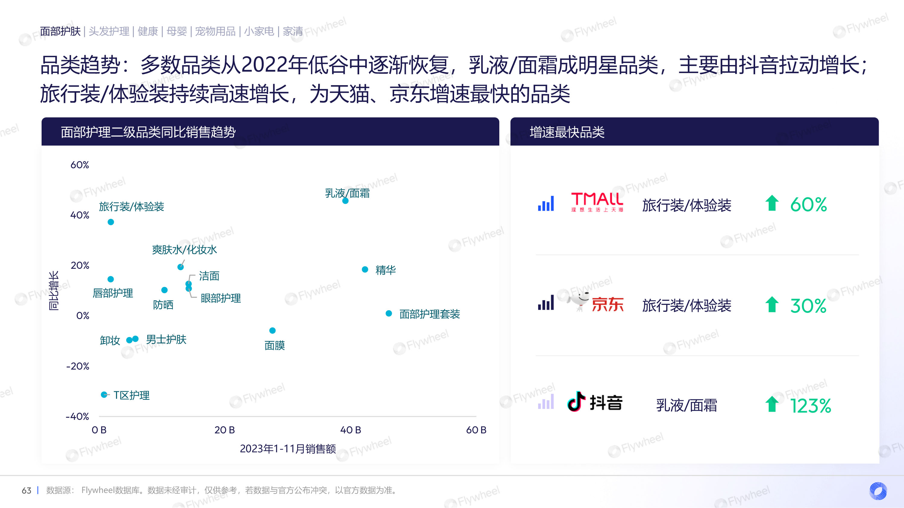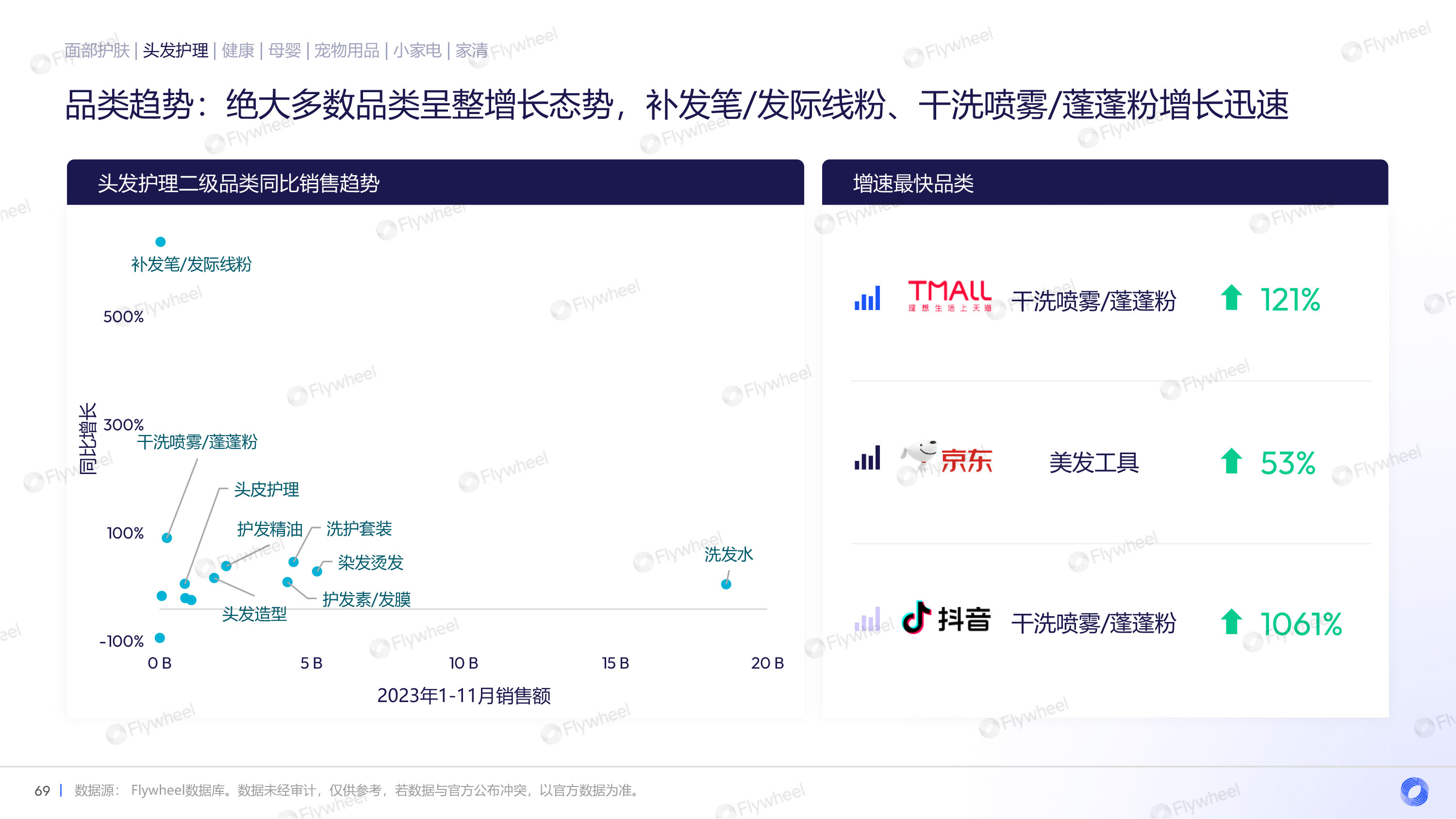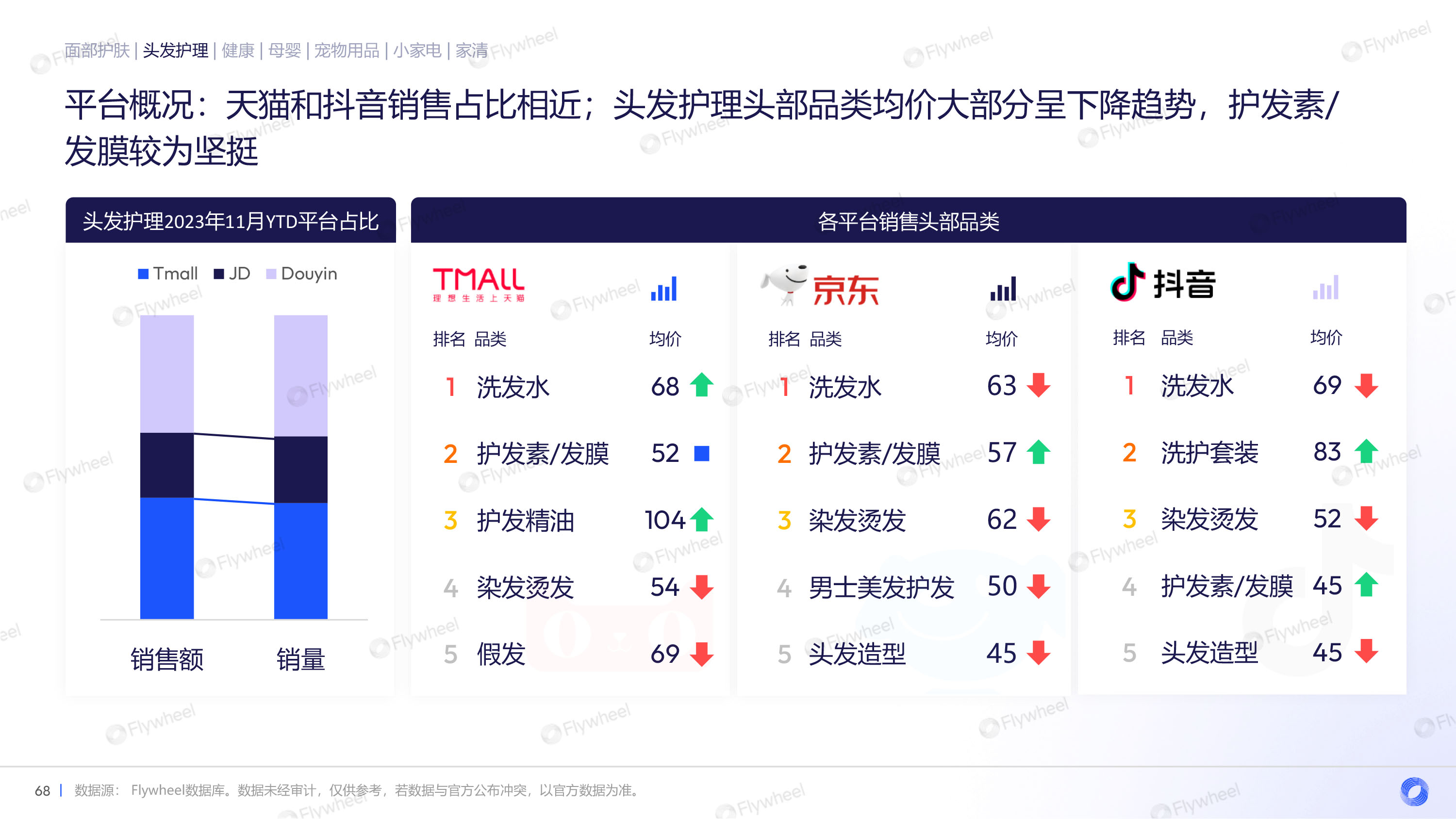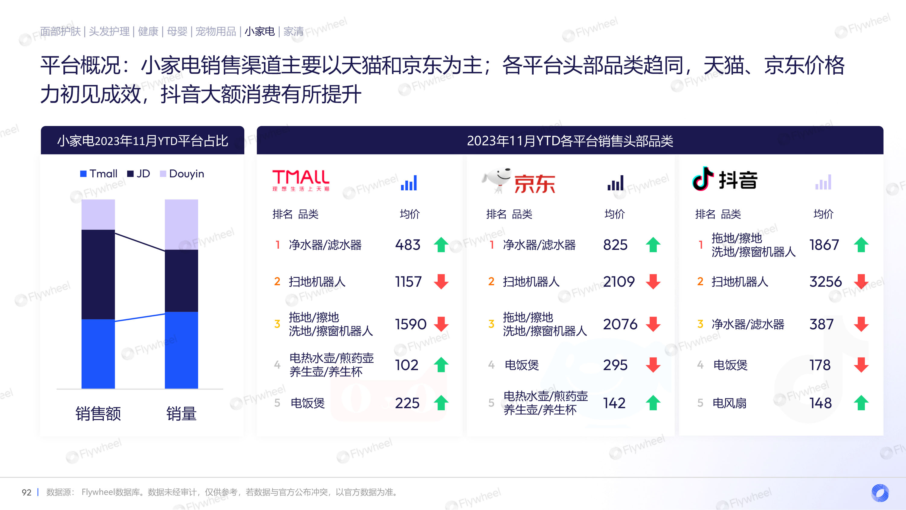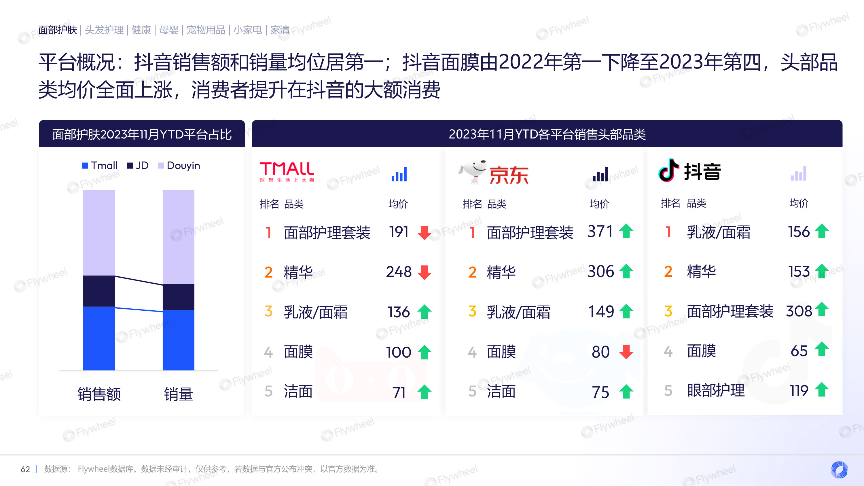 通过对面部护肤、头发护理、健康、母婴、宠物用品、小家电、家清等品类的分析,Flywheel发现,多数品类重振增长,均价上升,抖音渠道增长迅速,细分品类暗藏玄机。
