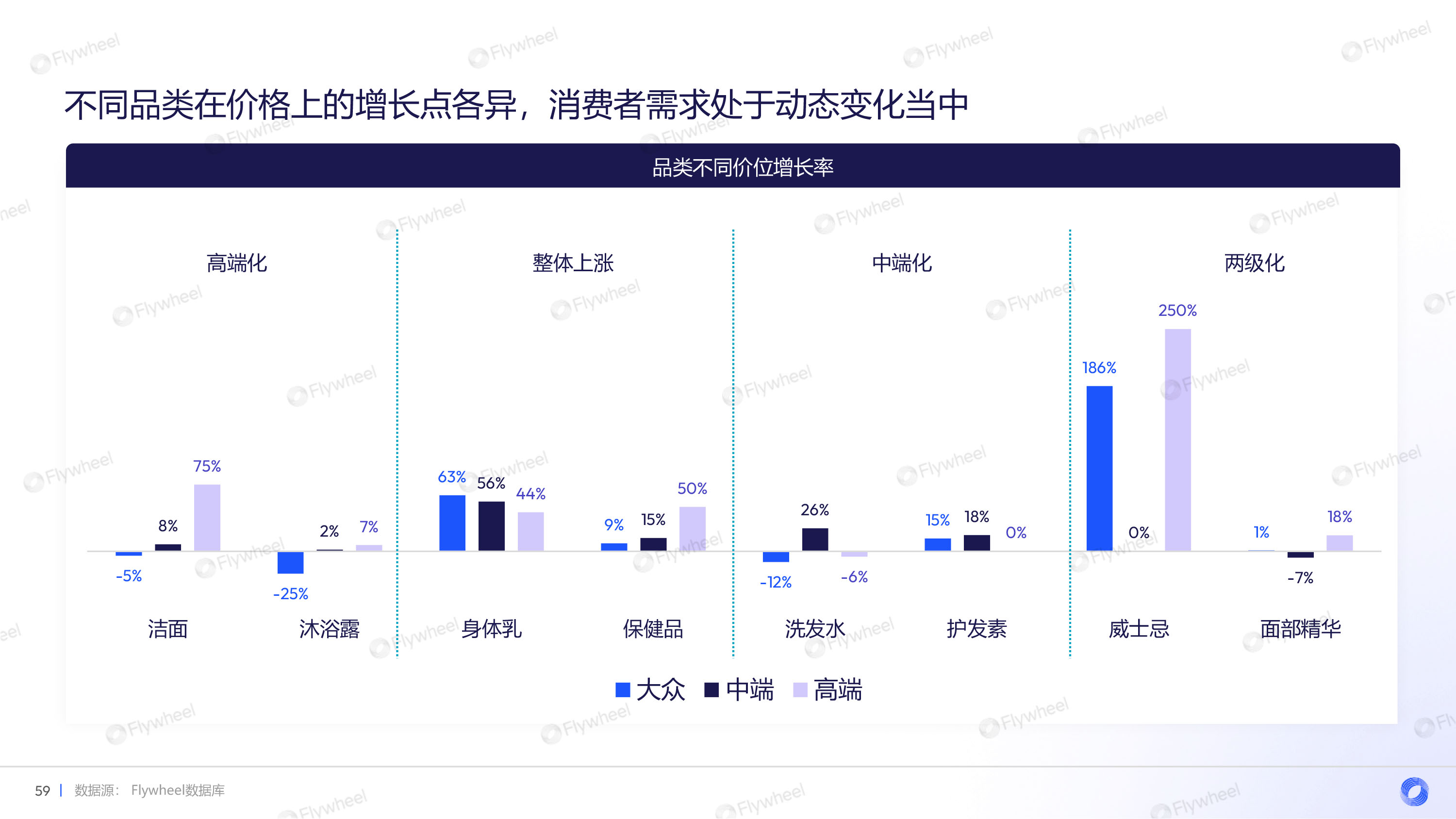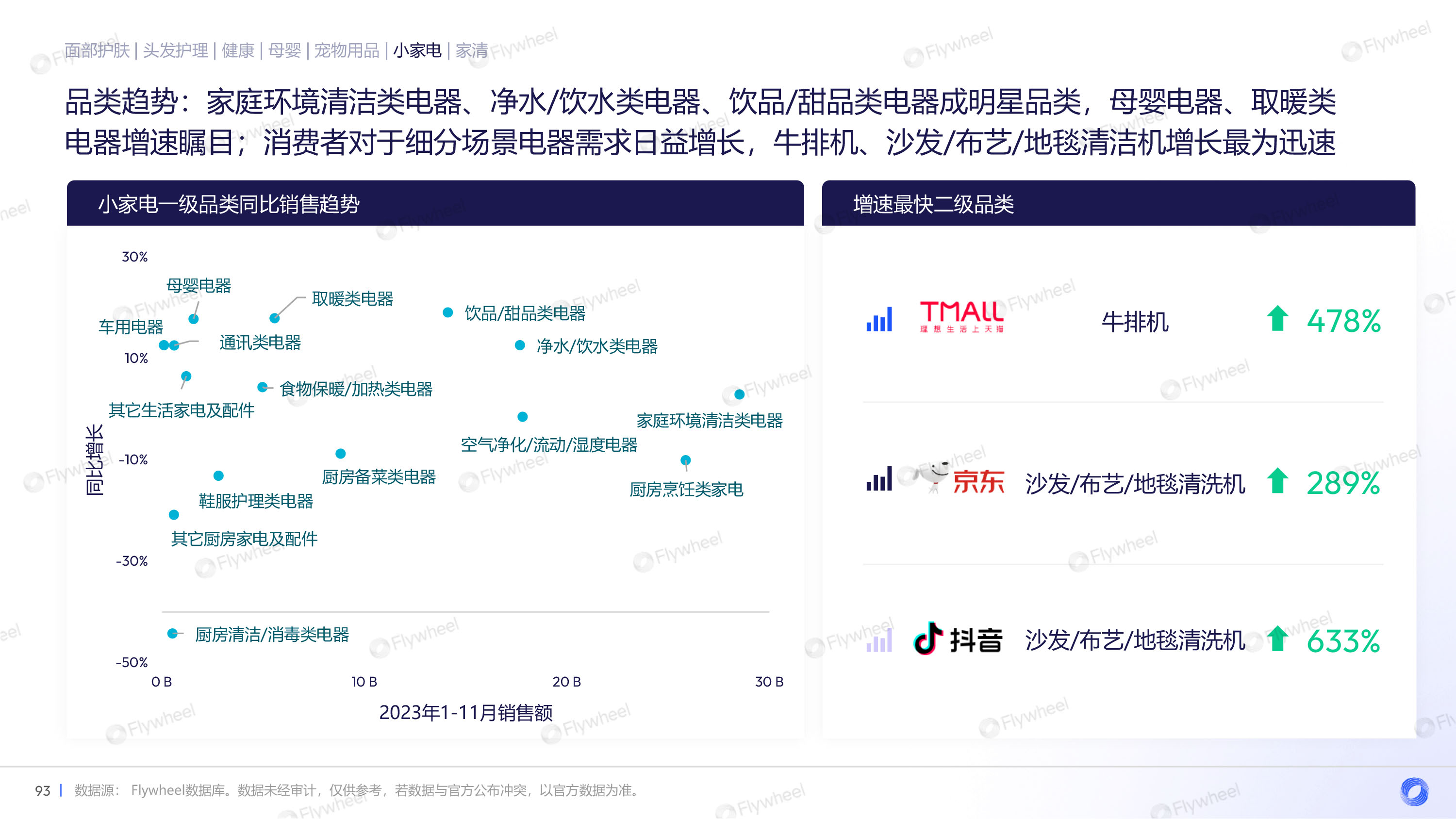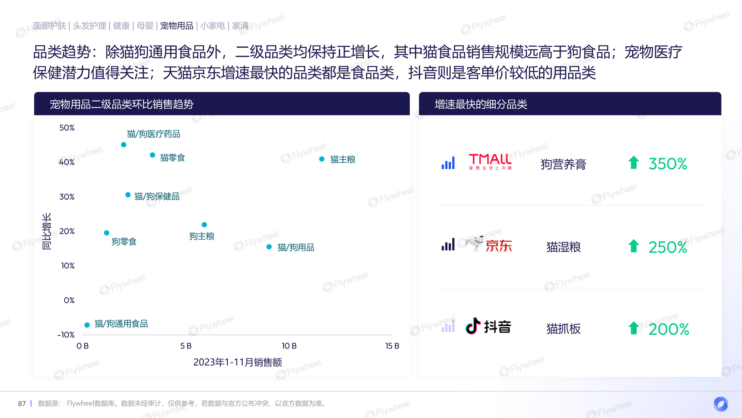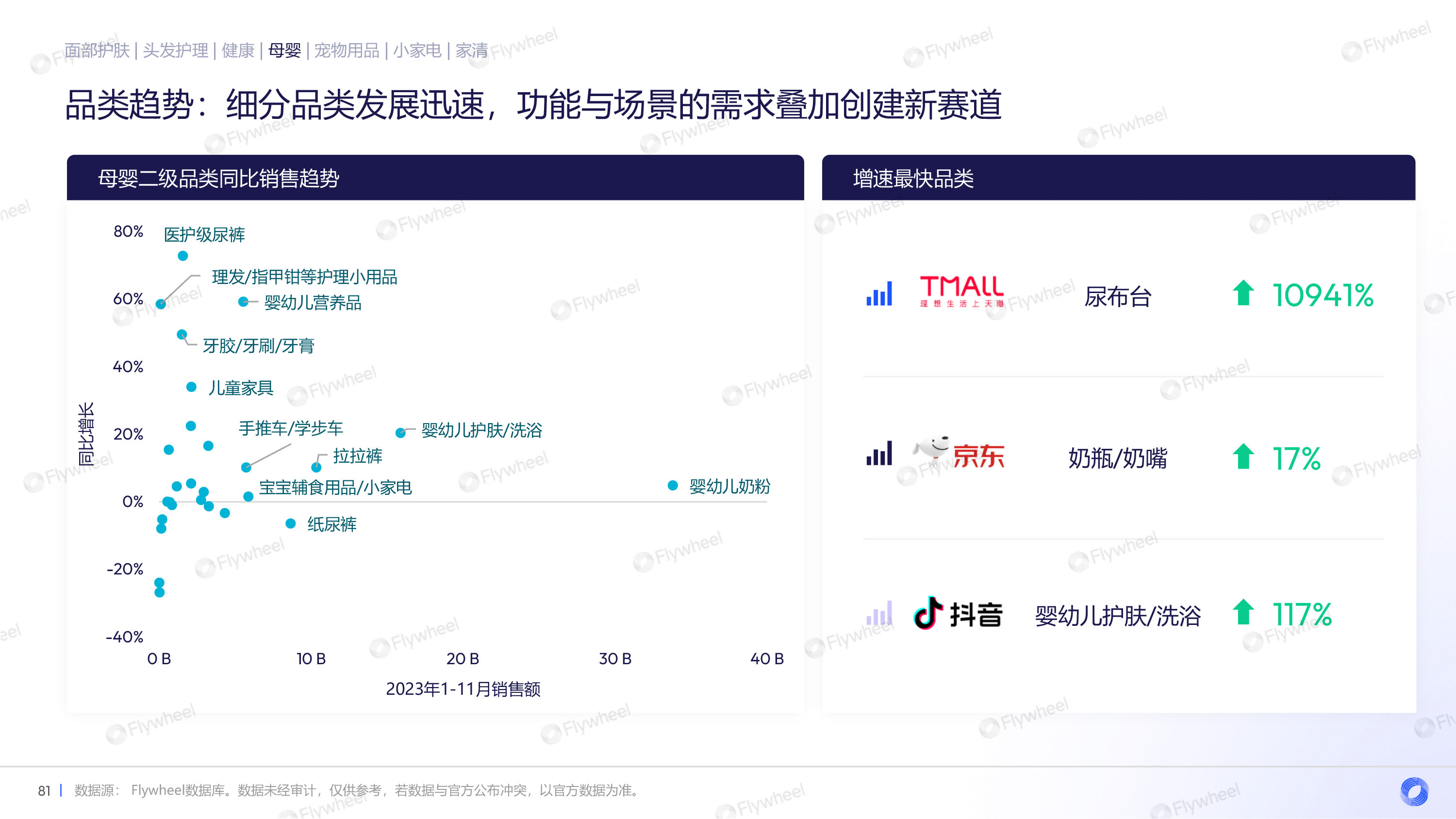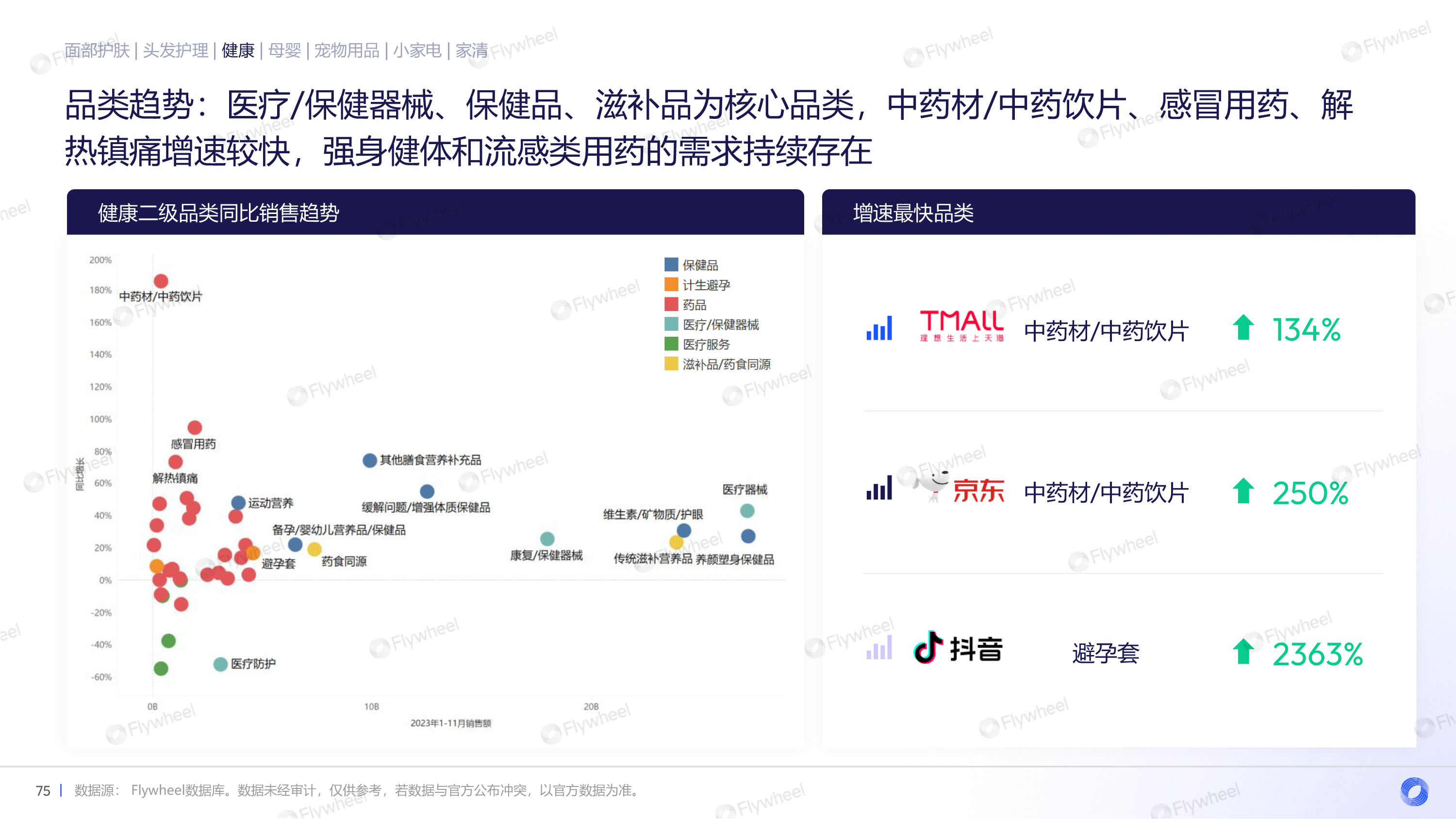 通过对面部护肤、头发护理、健康、母婴、宠物用品、小家电、家清等品类的分析,Flywheel发现,多数品类重振增长,均价上升,抖音渠道增长迅速,细分品类暗藏玄机。