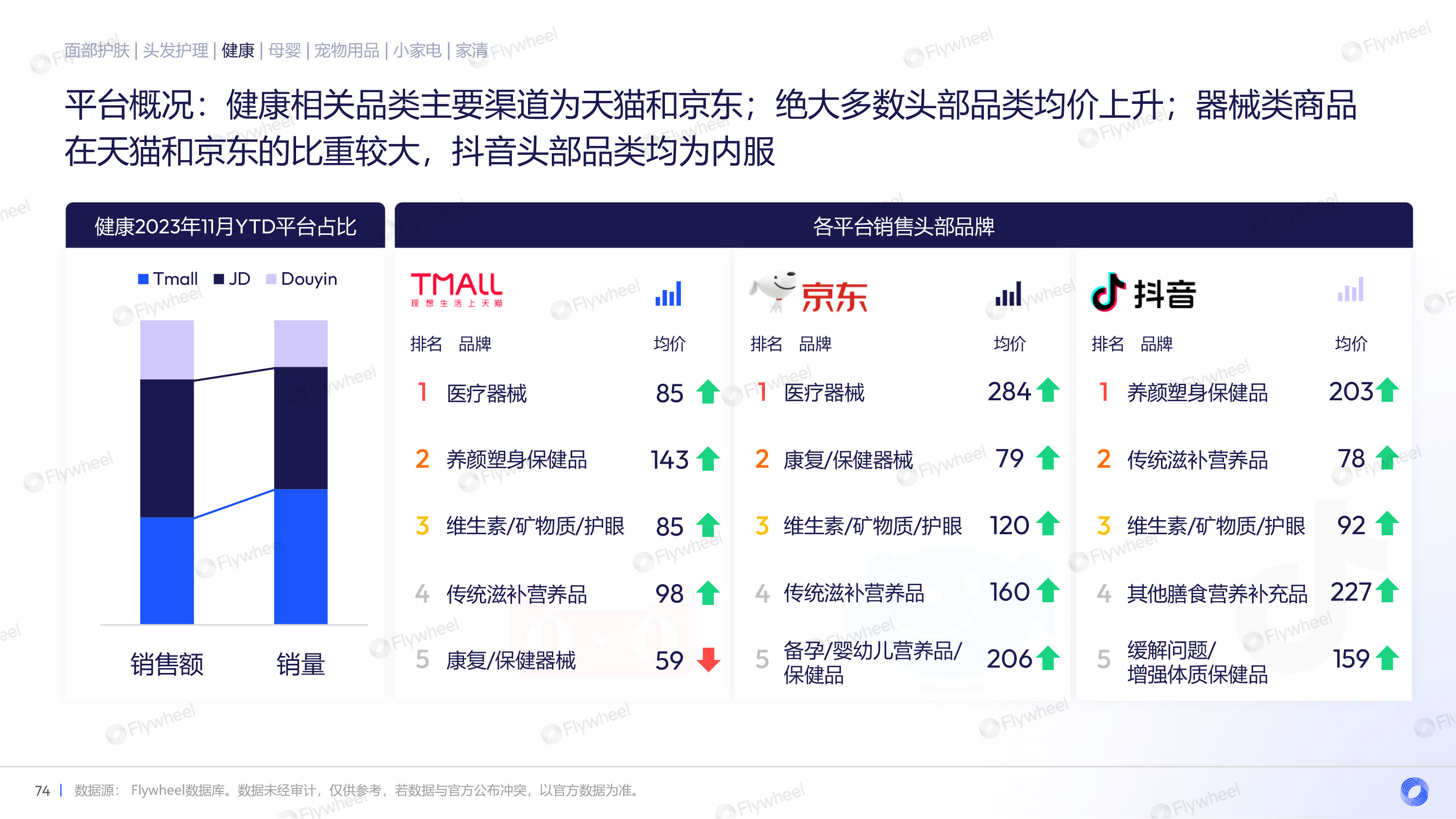 健康品类中,主要渠道为天猫和京东,多数头部品类均价上升,器械类商品在天猫和京东的比重较大,抖音头部品类均为内服,强身健体和流感类用药的需求持续存在。