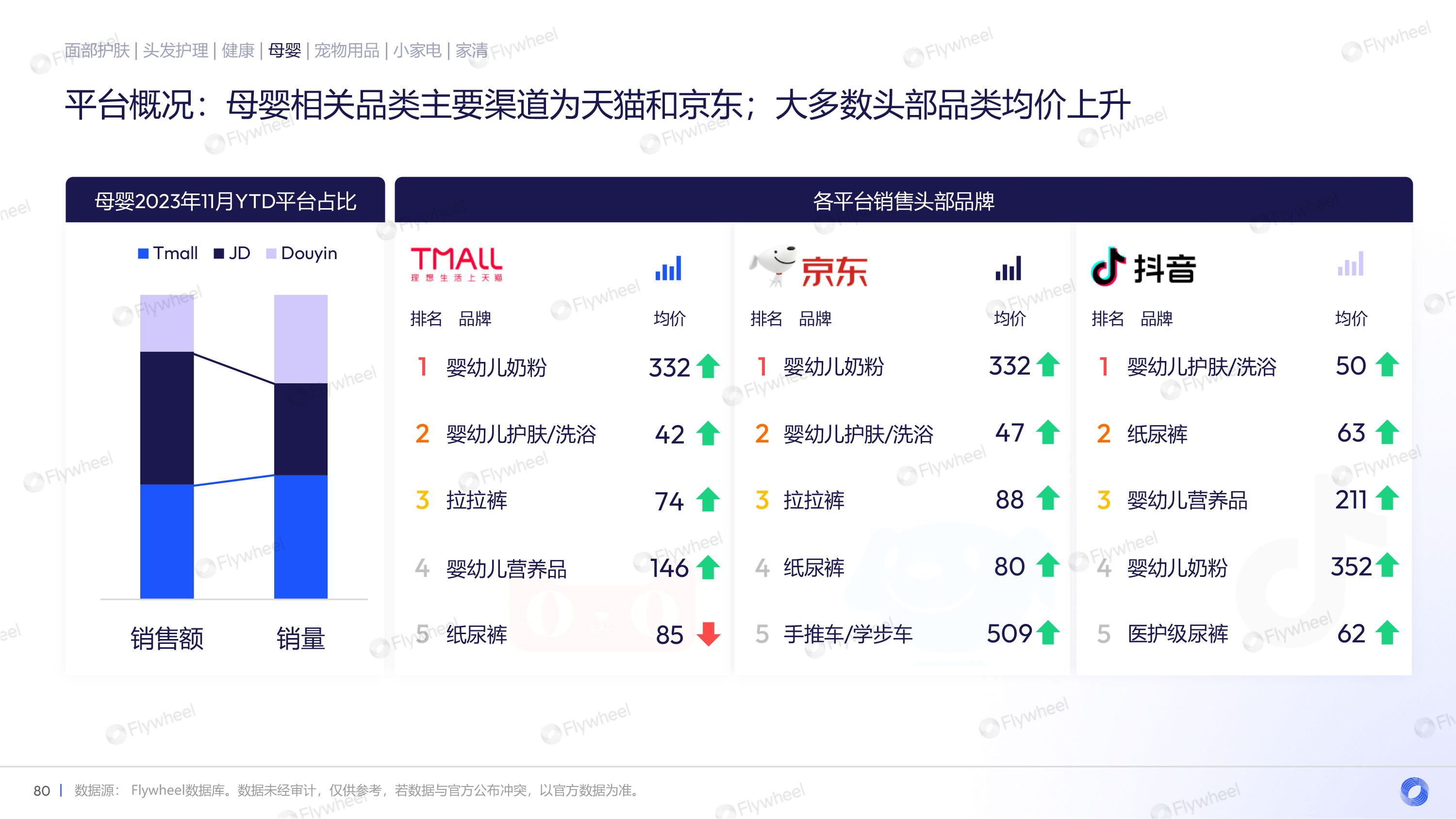 母婴品类中,主要渠道为天猫和京东,大多数头部品类均价上升。细分品类发展迅速,功能与场景的需求叠加创建新赛道。