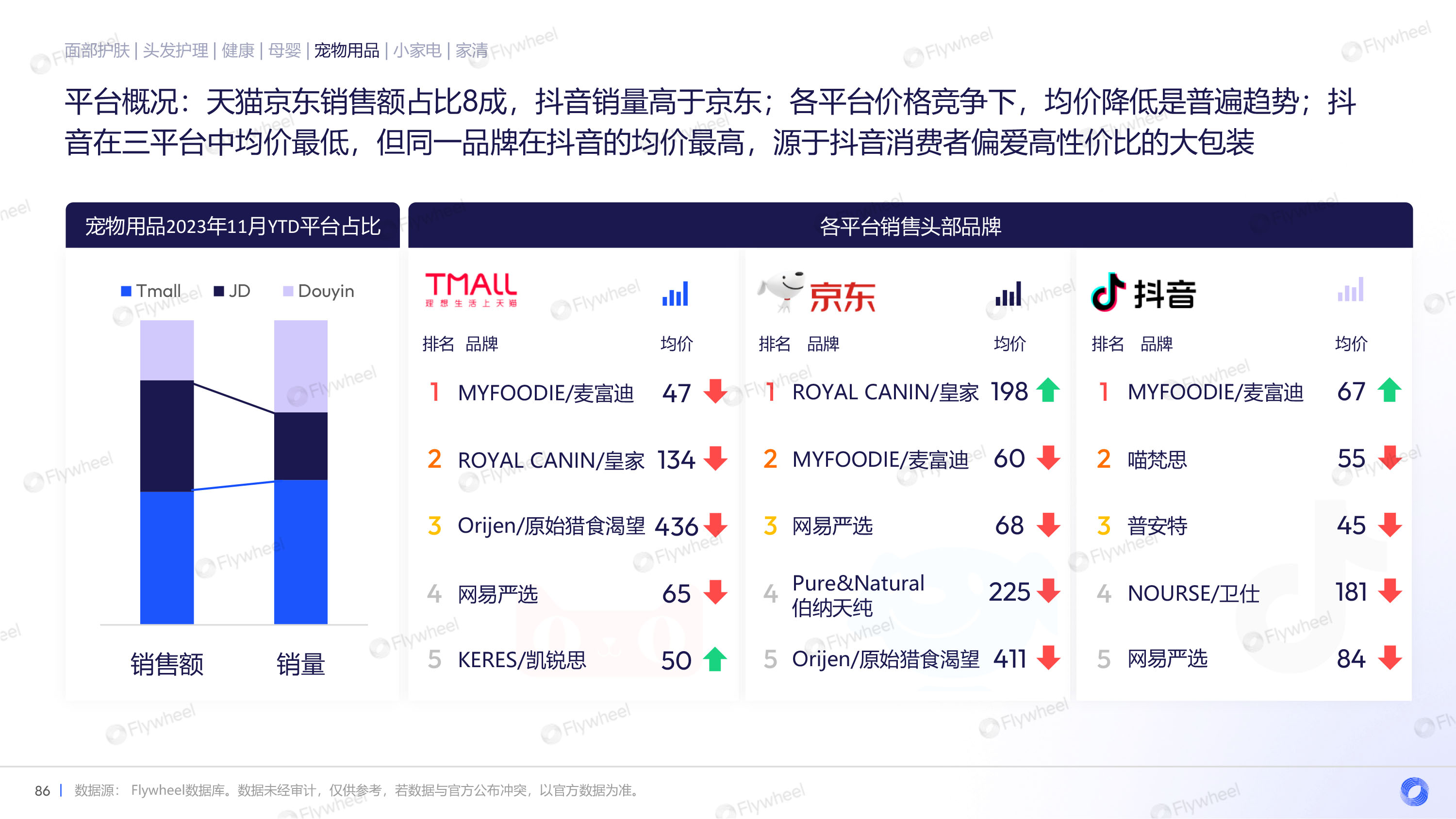 宠物用品中,天猫京东销售额占比8成,但抖音销量高于京东。各平台价格竞争下,均价降低是普遍趋势。多数品类保持正增长,其中猫食品销售规模远高于狗食品,宠物医疗保健潜力值得关注。